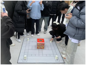 此次“反诈游园会”总共开展了三个游戏环节,待活动组织人分好各个小组之后,游戏正式开始。首先开始的是“反诈飞行棋”,同学们通过抽取纸箱内的反诈题目来获得前进步数,大家围成一团,胜负欲满满,为了争取时间,大家一起为答题者出谋划策,竞争异常激烈,出乎意料的是,大家对于日常反诈知识也是了解颇多,很多组都在极短的时间内完成了游戏。随后进入第二关反诈知识竞赛,答题者选出正确选项便可以向着前方的标志筒奔跑往返并与身后的队友击掌接力完成下一棒,待题目答完用时最短的队伍便能进入下一关,这一关的精彩程度不亚于飞行棋,当大家面对更加多样的题目时耗费了不少的精力,但同时,也知晓了更多的反诈知识,而且得到了适度的运动,更加有益于身心健康。