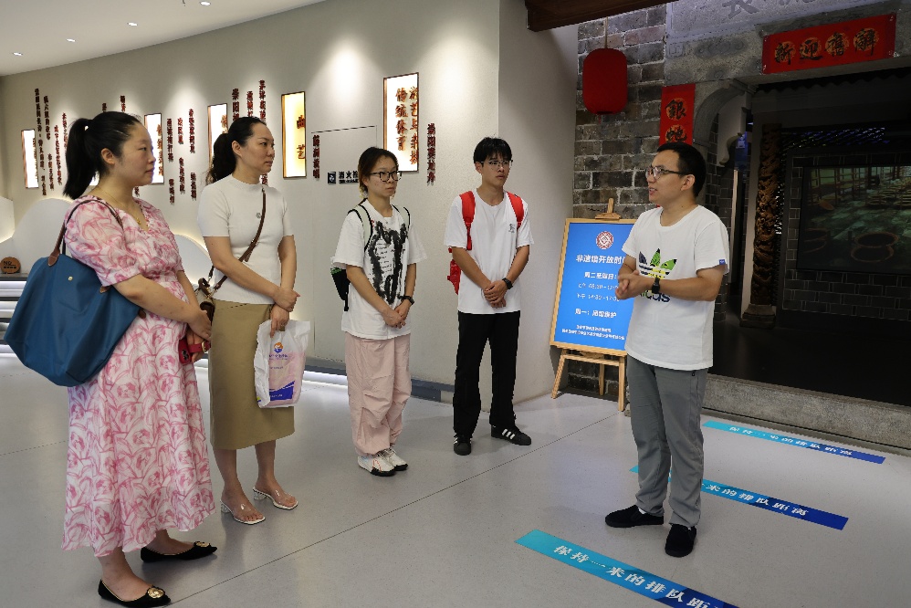 咸宁市非物质文化遗产保护中心负责人金顶挑老师热情接待了师生一行,并亲自引导参观讲解。在沉浸式的学习体验中,团队依次探访了传统美术、传统技艺、传统医药、传统表演艺术和民俗五大主题展区。从赵李桥砖茶历经时光的陈香,到通山木雕巧夺天工的细腻刀法;从赤壁脚盆鼓撼人心魄的浑厚节奏,到崇阳提琴戏婉转悠扬的独特唱腔,成员们无不被咸宁深厚的文化底蕴和先民智慧所震撼。咸安桂花糕的甜蜜、嘉鱼野藕吊锅的鲜美、赤壁鱼糕的精致,不仅展现了地方饮食特色,更蕴含着浓厚的人文情怀;镇氏风湿病马钱子疗法则彰显了传统中医药的博大精深。春节的戏凤凰、清明的祭祖踏青、端午的龙舟竞渡、中秋的守月华……这些鲜活的岁时节庆习俗,生动勾勒出咸宁独特的地域风情画卷。