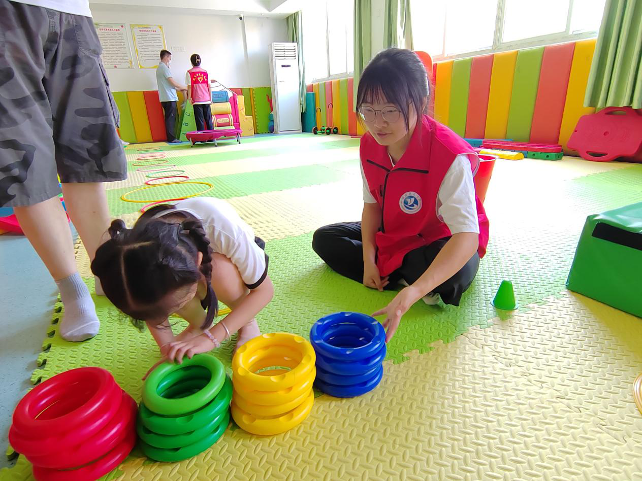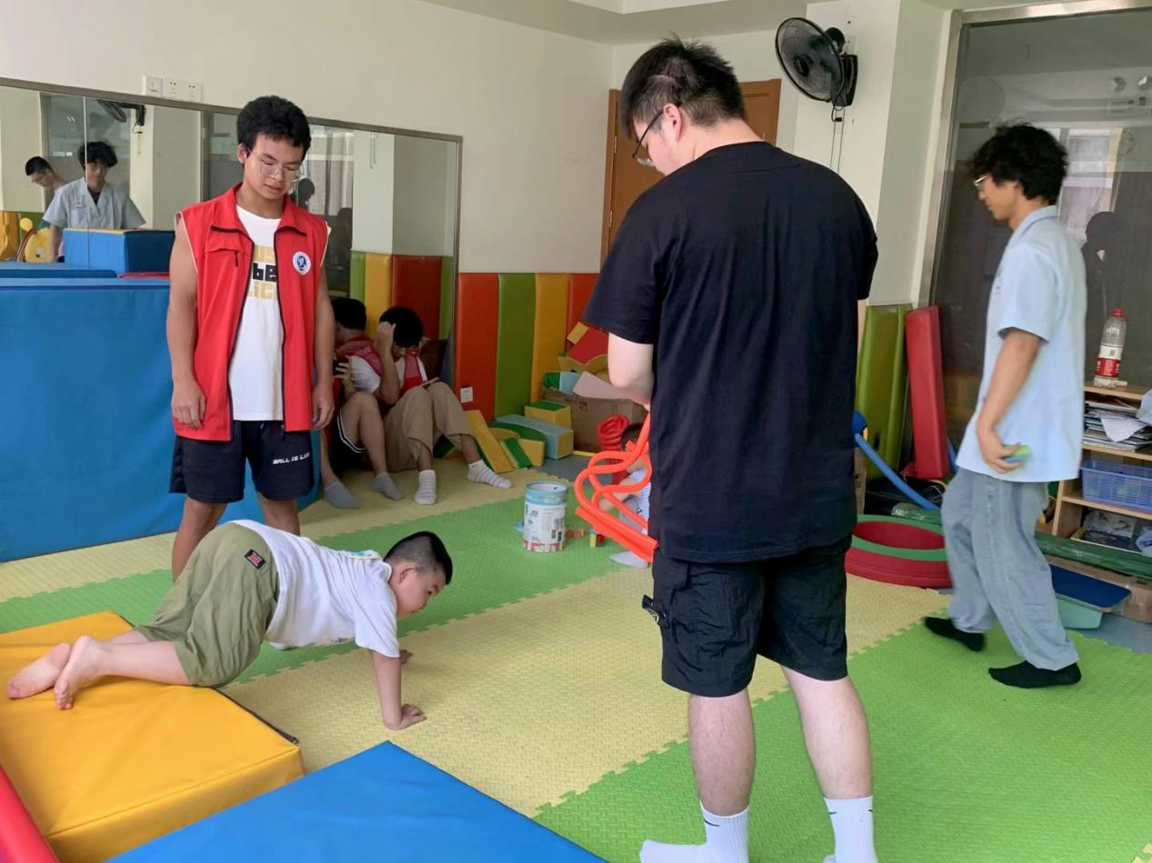 志愿者每日提前到达七彩梦康复中心,打扫场地、摆放教具后,静待同学们的到来。上课之际,志愿者跟随专业老师完成儿童的个性化治疗计划与教育方案。每天分上下午配合老师进行感统教学训练和进阶的体适能训练。