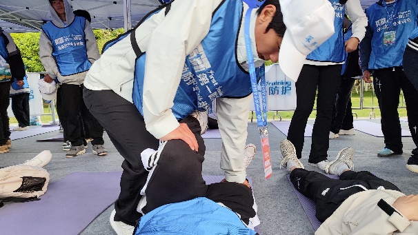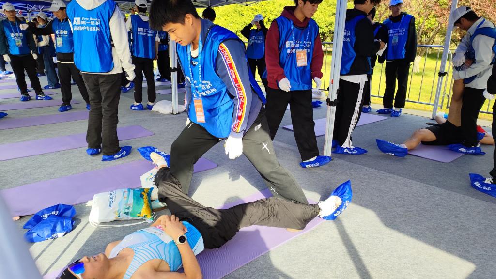 下午1点,完赛运动员陆续抵达终点,30名来自运动康复专业的志愿者早已架设好拉伸垫,化身“肌肉修复师”。“小腿肌肉紧张的跑者请往左侧,大腿乳酸堆积的请先做筋膜放松……”他们凭借扎实的专业知识,针对不同部位的运动损伤,精准运用筋膜枪、拉伸手法和放松指导。一位全马选手赛后感慨:“跑完腿像灌了铅,志愿者的拉伸让我瞬间‘回血’,咸宁的服务太贴心了!”据统计,3小时内他们累计服务2000余人次,许多跑者起身时主动与志愿者击掌、竖起大拇指,用最直接的方式表达谢意。