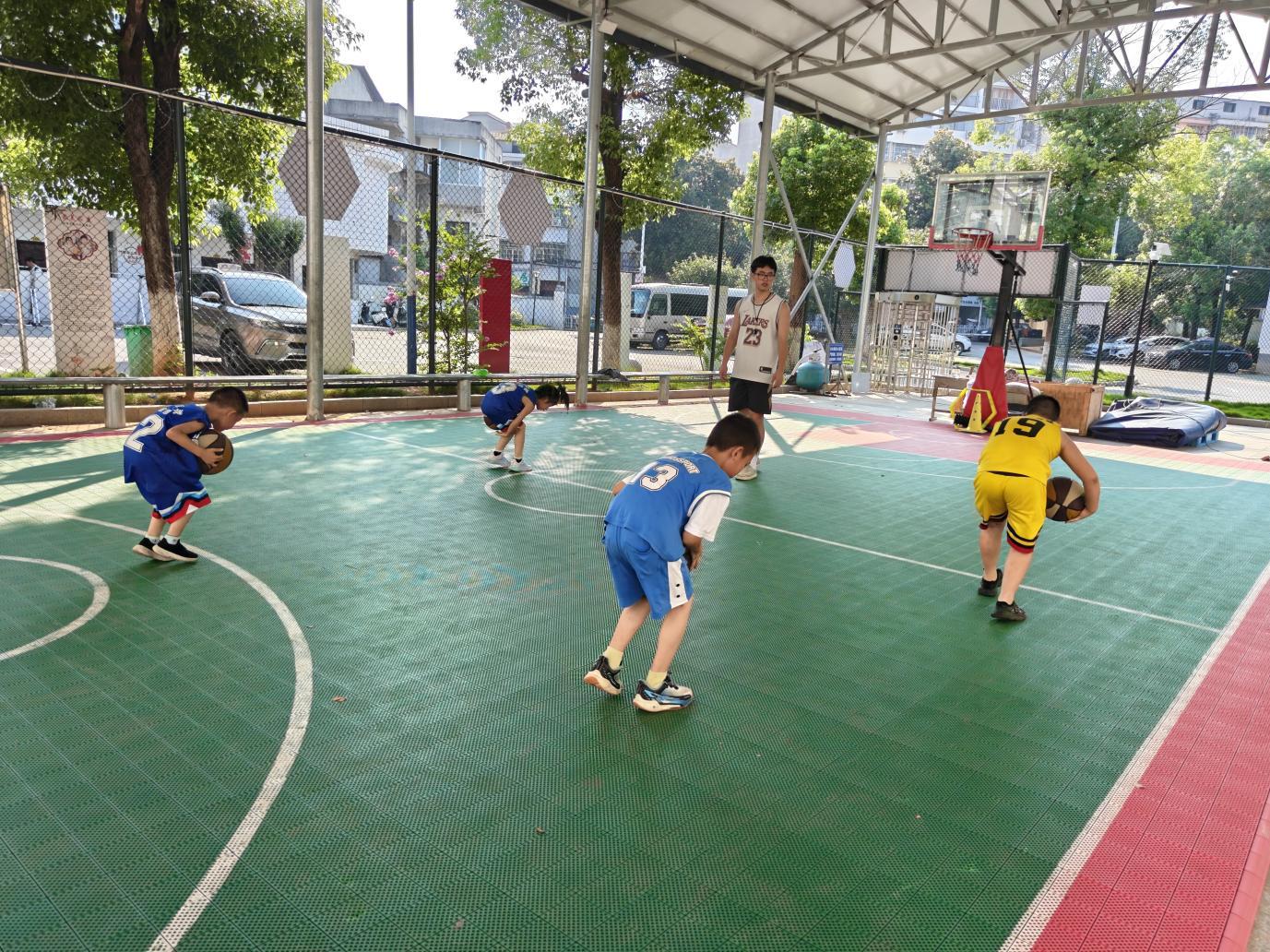 带队老师看到村委会篮球场上的孩子们在打篮球,抽调篮球专选班志愿者,走进篮球场,为孩子们指导正确的篮球运球动作,组织孩子们学习篮球球性