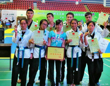 2013年8月8日至11日,由国家体育总局和中国跆拳道协会共同主办的全国大众跆拳道锦标赛在安徽省黄山市体育馆进行。全国大众跆拳道锦标赛是国内最高级别的大众跆拳道赛事,一年一度举办一次,今年共有来自全国28个省市111支代表队约1300余名运动员参赛。湖北科技学院代表队在领队付建民教授、教练员阮胜副教授的带领下,共有8名队员参加了青年组品势项目的全部比赛。虽然对手实力非常强大,甚至还有参加过世界大赛的国家示范团队员参加,但强大的对手更激发了队员们的斗志。经过4天的顽强拼搏,队员们最终取得了优异成绩。
