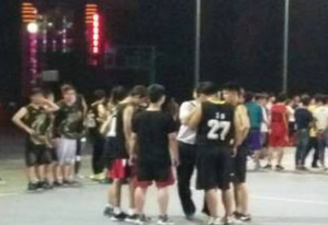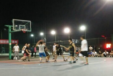 临近傍晚,篮球场上已亮起灯光,参赛运动员及场外观众热情高涨地等待着比赛的开始。第一天的小组赛参赛队伍共有八支,分为四场同时进行比赛。一袭黑色战服的云豹队对阵ace队、身穿白色球服的英雄联盟队对阵战狼队、1305队对阵刘勇口腔队,最后的场地则是野马队对阵野牛队。