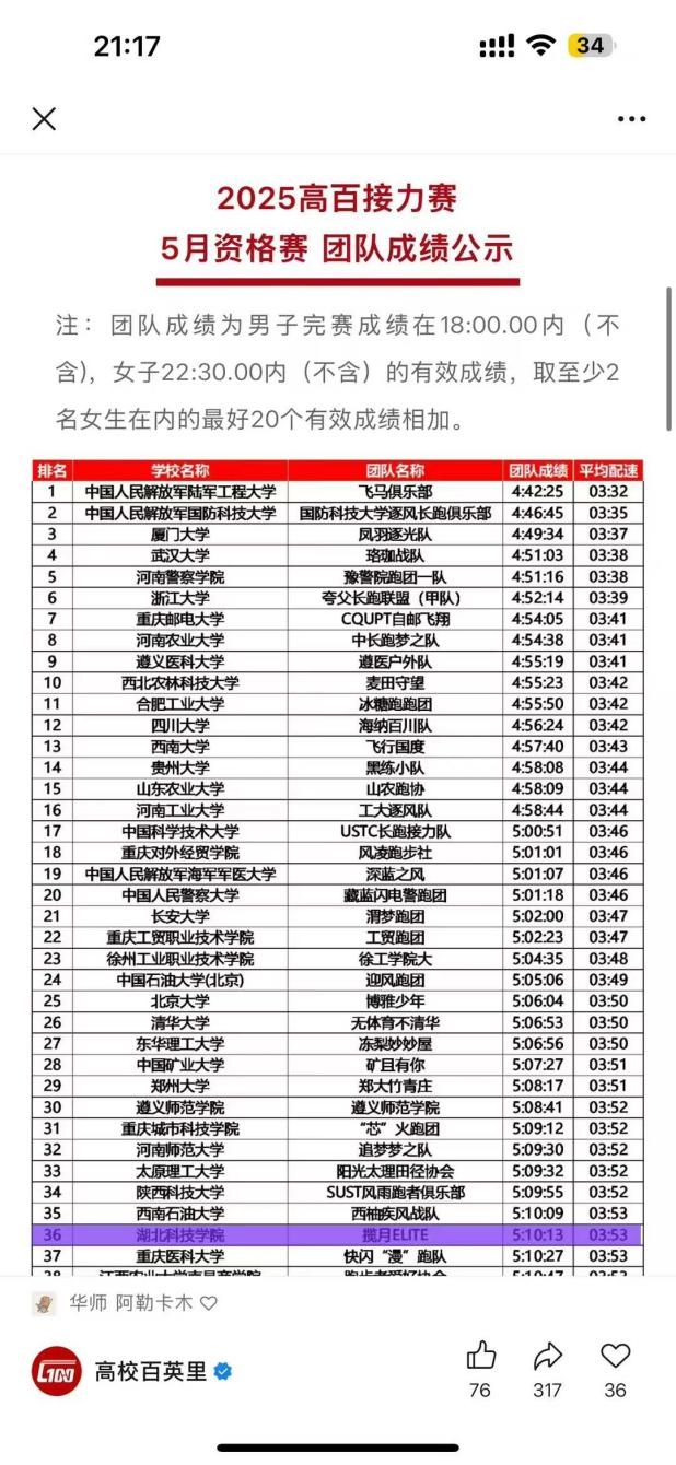 2025年5月21日晚,随着成绩公示的捷报传来,2025高百接力赛5月资格赛正式圆满结束。在这场汇聚全国高校精英的耐力对决中,湖北科技学院揽月ELITE跑团以昂扬斗志和顽强意志勇创佳绩,斩获全国第36名、湖北省第2名的骄人战绩,用脚步丈量青春的高度,用汗水诠释拼搏的意义!