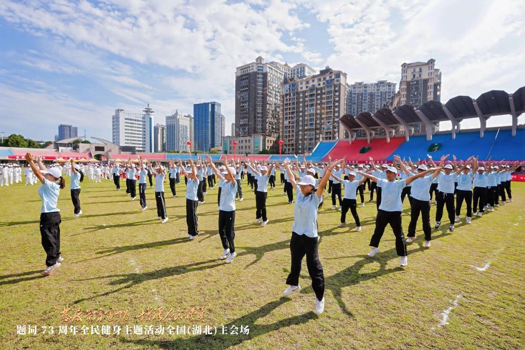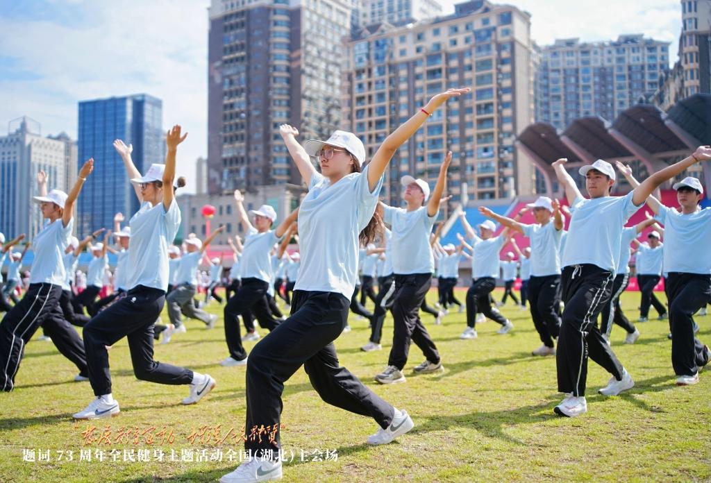 6月14日上午9时,咸宁体育中心体育场内,第一套广播体操展演正式拉开帷幕。随着熟悉的旋律响起,112名体育学学生身着统一服装,以标准的动作、饱满的精神亮相。他们的每一个伸展、每一次转体都充满力量感,整齐划一的动作,成为全场焦点。令人振奋的是,展演过程中,相邻的广场舞展演方阵(120人)、太极拳展演方阵(180人)、柔力球展演方阵(120人)和武术展演方阵(100人)的参演者纷纷被感染,自发加入广播体操的队列中。一时间,不同年龄段、不同项目的健身爱好者共同随音乐舞动,形成千人同做广播体操的壮观场面。
