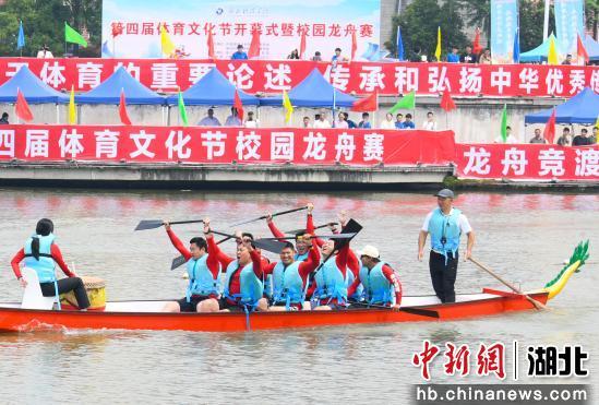 中新网湖北新闻5月27日电(陈红菊 王丹)鼓声劈浪,飞桨逐云。5月24日,湖北科技学院第四届体育文化节开幕式暨校园龙舟赛在揽月湖畔火热启幕。22支龙舟劲旅——20支校内学院代表队与咸宁市教育局、咸宁市总工会两支特邀队伍同场竞技,以传统龙舟赛的激情对决,奏响端午文化传承与校园体育融合的激昂乐章。