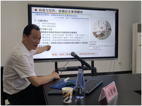 白晋湘教授以《体育类核心期刊的构思与写作》为题,从关于学校教学目标的重要性,计划、制度、标准、方法、培训、流程、检查、考核、奖罚及学生培养等方面进行了分享。白教授针对体育类核心期刊的概况和投稿要求,强调了高质量论文对于提升学校学术声誉的重要性并结合具体的论文案例,详细分析了论文构思与写作的技巧和方法,带领团队撰写论文的经验和心得,如何使用国内外文献数据库及检索系统等,为教师们提供了宝贵的科研资源。学术活动现场气氛活跃,在互动环节,参会教师针对学术论文撰写及课题申报过程中存在的问题与白教授进行了深入交流。教师们纷纷表示,此次讲座内容丰富、实用性强,对于加强体育专业内涵建设具有重要的指导意义。