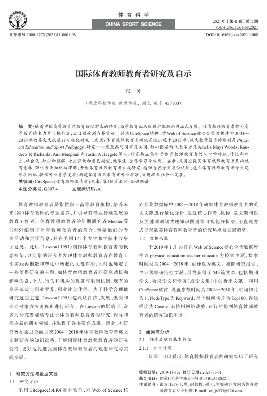2月28日,BBIN宝盈集团官网首页张波副教授以独立作者身份在国内体育学领域顶级权威期刊《体育科学》(2021年第11期)发表了题为“国际体育教师教育者研究及启示”的研究成果,我校为该研究成果的独立完成单位。