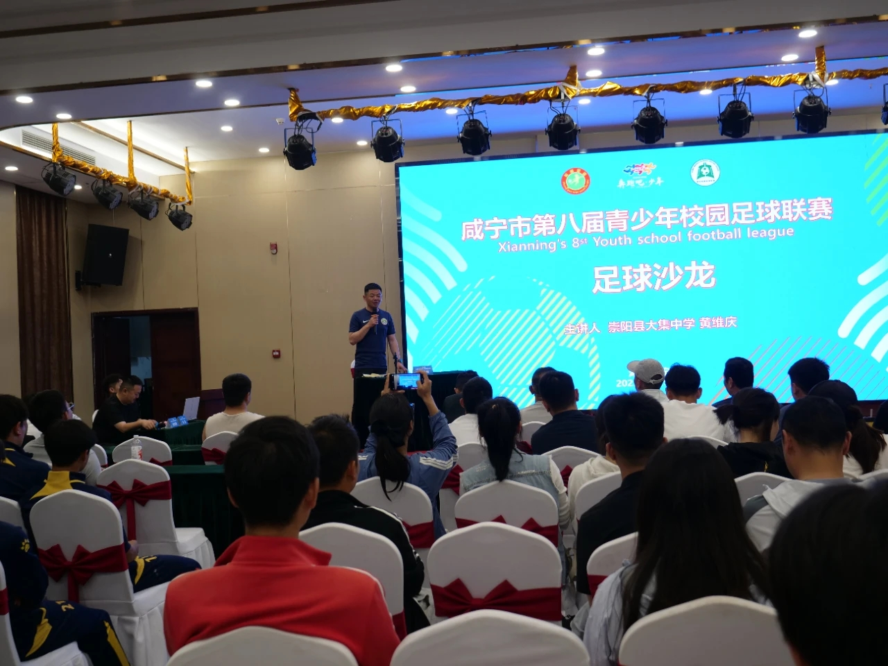 荆楚好老师、湖北省师德先进个人、咸宁市首届十大名师、湖北科技学院优秀校友、崇阳县大集中学体育教师黄维庆为全市校园足球教练员、体育教师代表、运动员代表授课