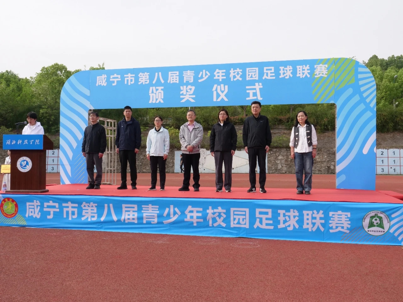 在闭幕仪式上,全体人员庄严肃立面向国旗,奏唱国歌。接着,裁判长秦会兵宣布比赛成绩,以及体育道德风尚奖、最佳射手、最佳守门员、优秀运动员、优秀教练员等名单。名单逐一揭晓,现场气氛热烈,欢呼声起伏。随后举行了颁奖仪式,与会领导为获奖代表队和个人颁奖。颁奖结束,梁薇致闭幕词。她对本次联赛的成功举办给予了充分肯定,表示将继续大力支持校园足球发展,为咸宁青少年展示风采、追逐梦想提供更广阔的舞台。最后,白育庭宣布本次联赛圆满闭幕。