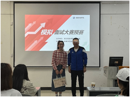 最终,4号选手何星谕凭借94.5分的高分获得了本次面试模拟赛的一等奖;张云龙,温芙荣两名同学获得本次大赛的二等奖;成怡静,胡金龙,李玲三名同学获得大赛三等奖。老师们为获奖选手们一一颁发奖品。